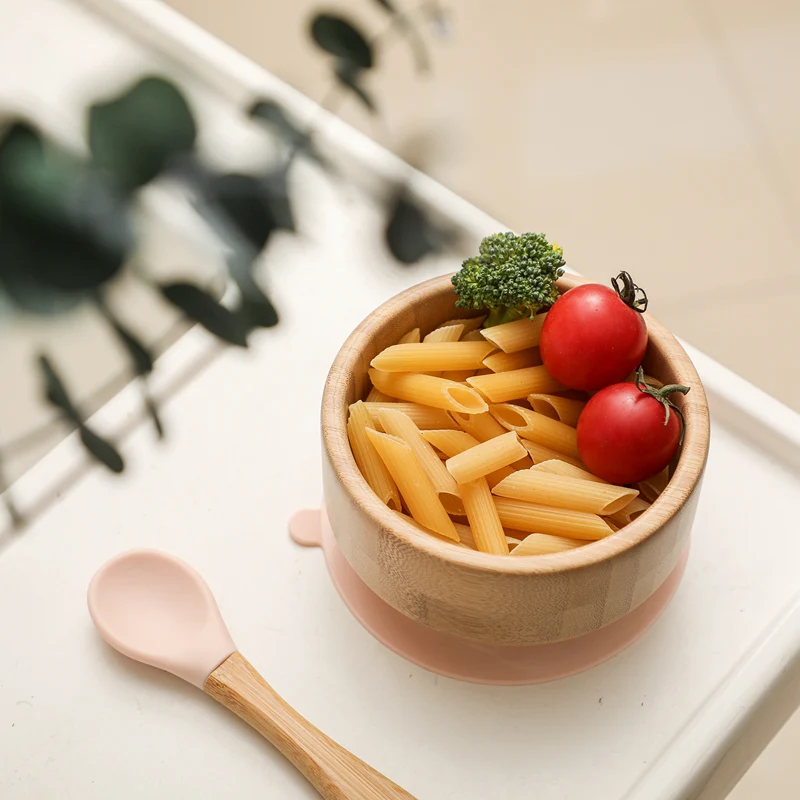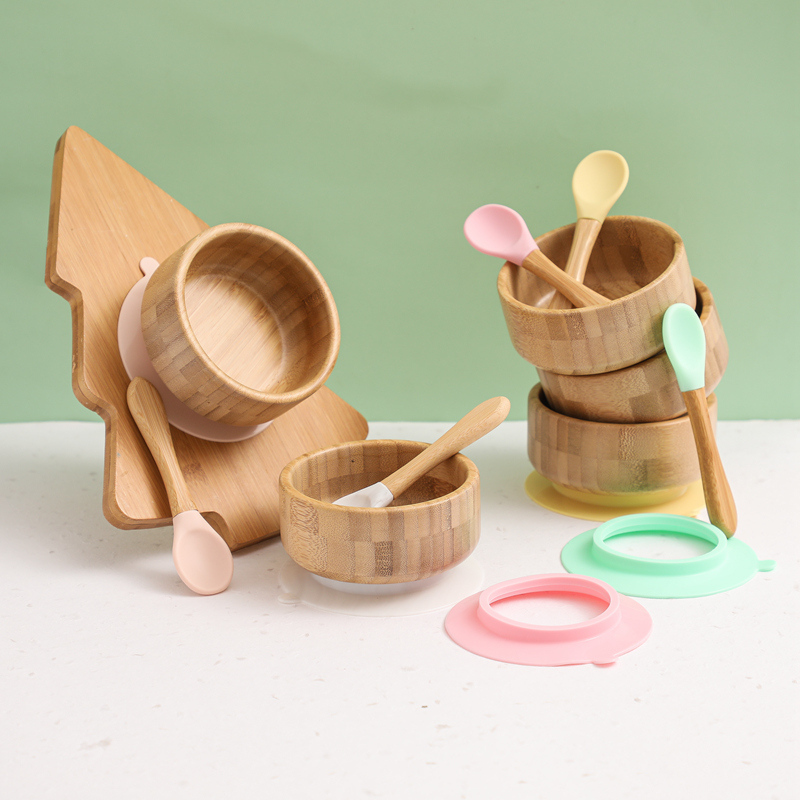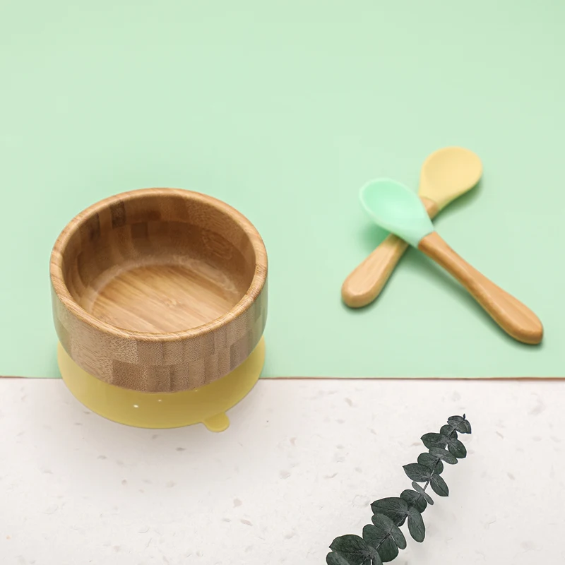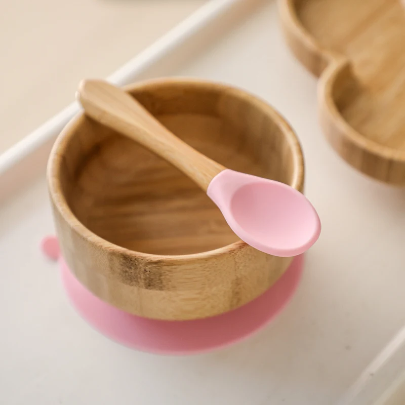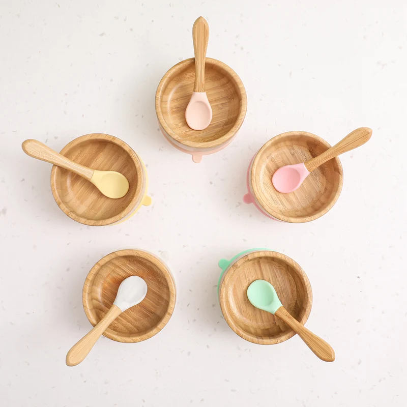 2PCS/SET Baby Feeding Tableware Bamboo Bowl Silicone Spoon Waterproof Suction Set Non-Slip Crockery Baby Dishes Kitchenware